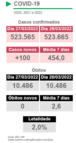 Mato Grosso do Sul inicia a semana com 100 novos casos confirmados de Covid. Conforme Boletim Epidemiológico desta segunda-feira (28) são 8 municípios com novas infecções: Itaporã (66), Campo Grande (19), Paranaíba (7), Dourados (3), São Gabriel do Oeste (2), Água Clara (1), Ribas do Rio Pardo (1), Sidrolândia (1).