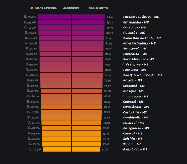 Em 2019 MS registrou 61,90 pontos; em 2020 foram 91,47 pontos; e em 2021 atingiu 95,66 pontos. Os outros estados que obtiveram nota A em 2021 foram Amazonas, Bahia, Espírito Santo, Goiás, Paraná, Pernambuco, Santa Catarina e Tocantins. As menores notas foram obtidas por Roraima, com D, e Amapá, com C. As demais 16 unidades da Federação obtiveram nota B.
