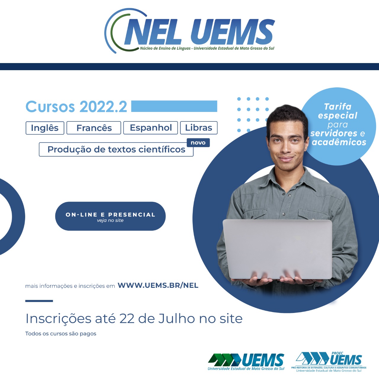 Núcleo de Ensino em Línguas (NEL) da Universidade Estadual de Mato Grosso do Sul (UEMS) está com matrículas abertas para os cursos de Inglês, Francês, Espanhol, Libras e Produção de Textos Científicos (curso NOVO). O prazo para matrícula vai até 22 de julho, mediante pagamento de taxa de inscrição. ACESSE O SITE DO NEL AQUI.