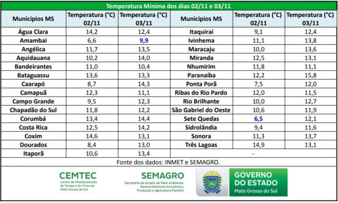 No feriado de Finados, a menor temperatura registrada foi em Sete Quedas: 6,5ºC. Amambai (6,6°C), Caarapó (8,7º), Campo Grande (9,5º), Dourados (8,4ºC), Itaquiraí (9,1ºC), Ponta Porã (7,5ºC) e Sidrolândia (6,5ºC) também registraram mínimas abaixo de dois dígitos na quarta-feira (2).