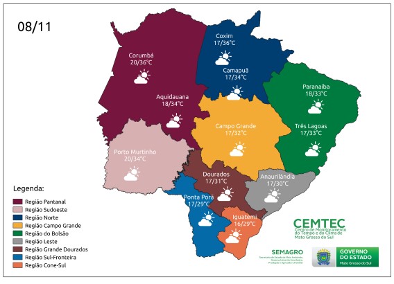 Na região Norte, em Coxim, a máxima chega a 36°C, com mínima 17°C. Em Ponta Porã a temperatura varia entre 17°C (mínima) e 29°C (máxima). Já em Iguatemi, no extremo-sul do Estado, a mínima será de 16°C e máxima de 29°C.