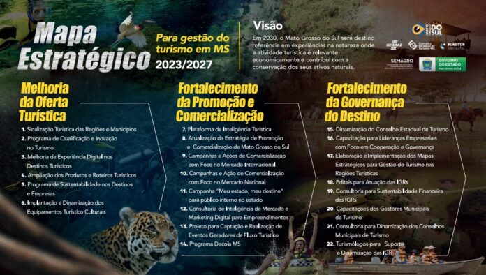 Foi lançado na ultima quinta-feira (17) o Mapa Estratégico para gestão do turismo em MS 2023/2027, instrumento fundamental para nortear as ações de fomento do turismo de Mato Grosso do Sul. Elaborado em conjunto com o Conselho Estadual de Turismo (CET) e entidades que fazem parte do Conselho, teve apoio de assessoria especializada em planejamento estratégico.