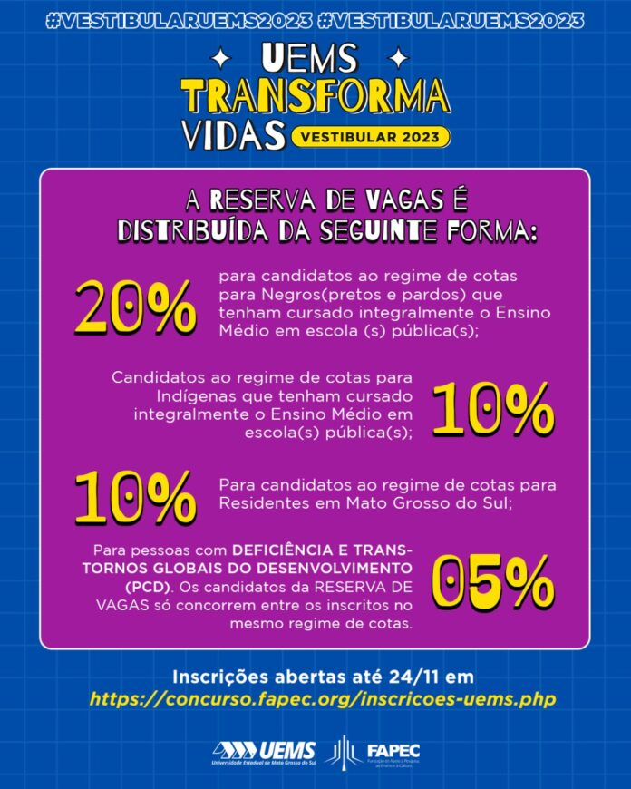A Universidade Estadual de Mato Grosso do Sul (UEMS) reserva no Processo Seletivo Vestibular 2023 o total de 45% das vagas para cotistas, sendo 20% para negros/as (pretos/as e pardos/as), 10% para indígenas, 10% para residentes em Mato Grosso do Sul e 5% para pessoas com deficiência e transtornos globais do desenvolvimento (PCD).