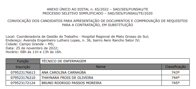 Conforme o edital n. 65/2022, os convocados listados no anexo único, habilitados para a função de técnico de enfermagem, deverão comparecer à Coordenadoria de Gestão do Trabalho, no Hospital Regional de Mato Grosso do Sul, na Avenida Engenheiro Luthero Lopes, n. 36, Bairro Aero Rancho, Setor IV, em Campo Grande, exclusivamente no dia 25 de novembro de 2022, das 08h às 11h e 13h às 16h, horário de Mato Grosso do Sul, para entrega dos documentos e comprovação de requisitos.
