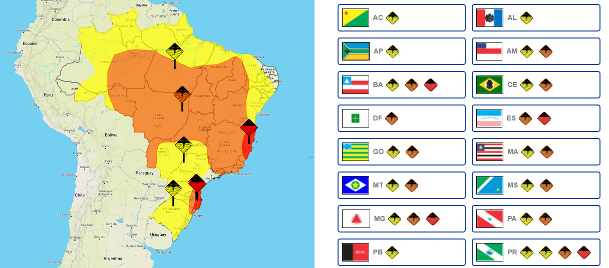 As demais áreas de Mato Grosso do Sul estão sob alerta amarelo, que indica possibilidade de chuvas de até 50 mm/dia e ventos intensos entre 40-60 km/h.