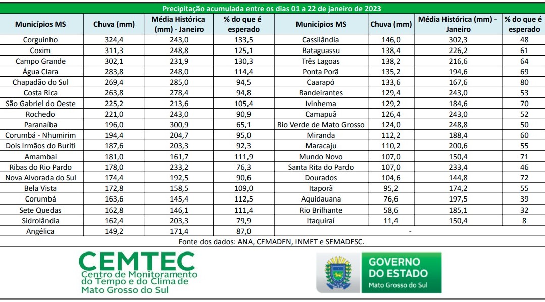 A lista conta também com Água Clara, Amambai, Bela Vista, Corumbá e Sete Quedas, conforme o que foi contabilizado entre os dias 1º e 22 de janeiro. A coleta conta com informações da ANA, Cemaden, Inmet e Semadesc.