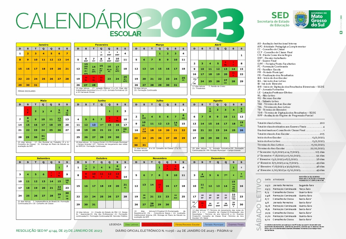 A SED (Secretaria de Estado de Educação) divulgou nesta terça-feira (24), no Diário Oficial Estadual, a Resolução/SED n° 4.144, que aprova o Calendário Escolar do ano letivo de 2023, a ser operacionalizado nas unidades escolares da REE-MS (Rede Estadual de Ensino de Mato Grosso do Sul) em todo o Estado.