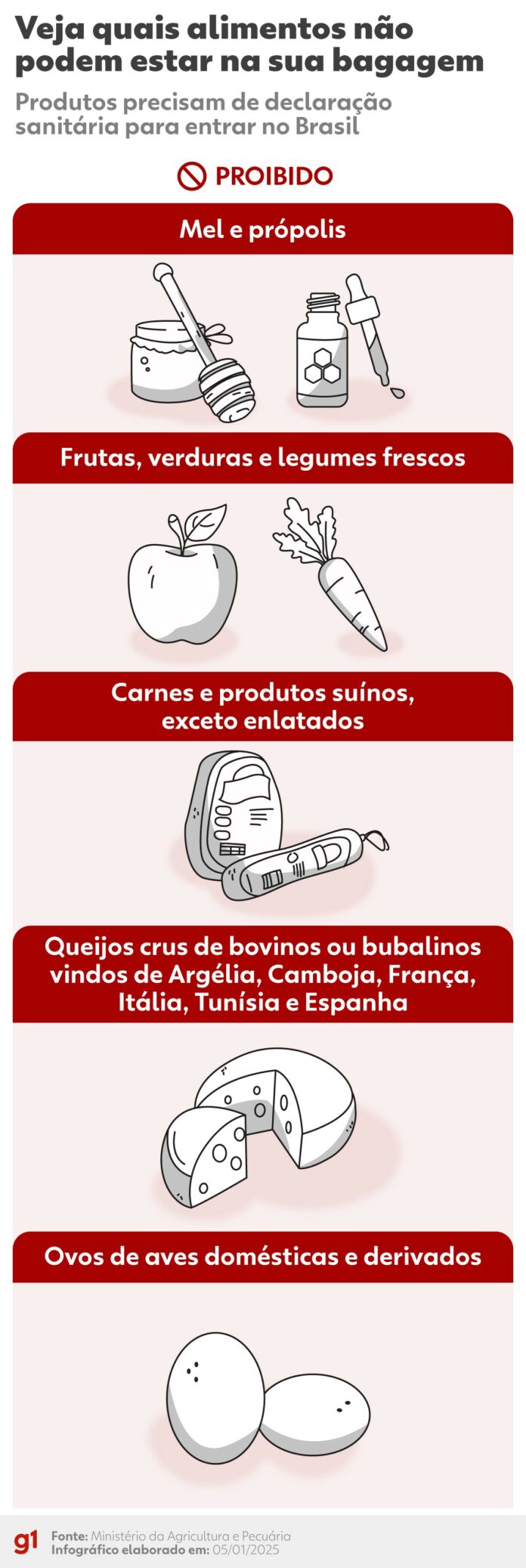 O ovo, por exemplo, não estava na lista de proibições de 2025, mas passa a integrar ela em 2026, informou o Ministério da Agricultura ao g1.