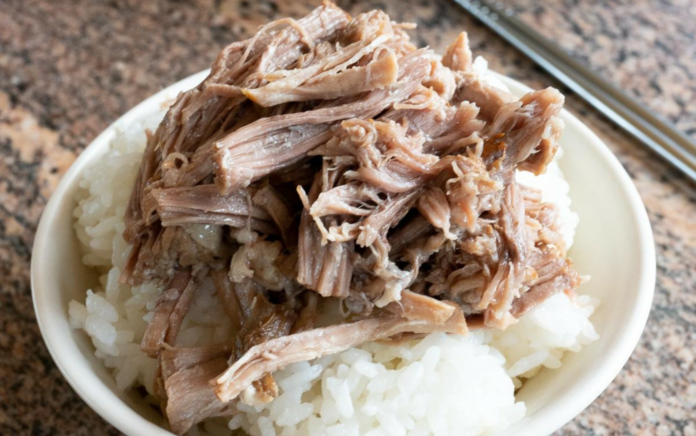 Imagem de arroz com carne de porco. Brasil bateu recorde nas exportações de carne suína em 2025