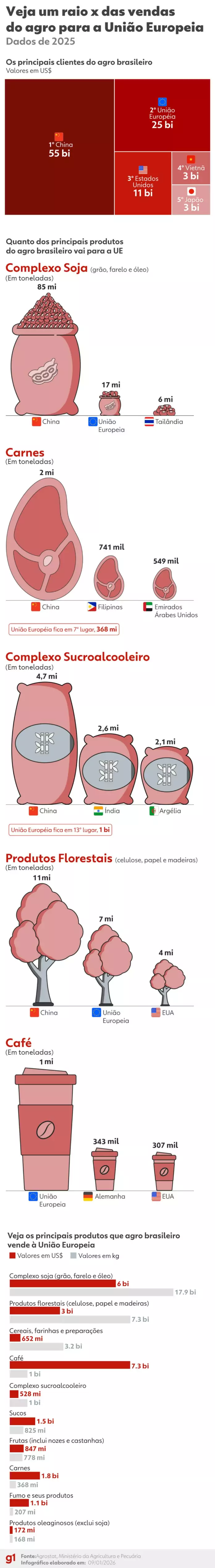 O Brasil, um dos maiores produtores de alimentos do mundo, deve ser um grande beneficiário do acordo. O bloco europeu já é o segundo maior cliente do agro brasileiro, atrás da China e à frente dos Estados Unidos.