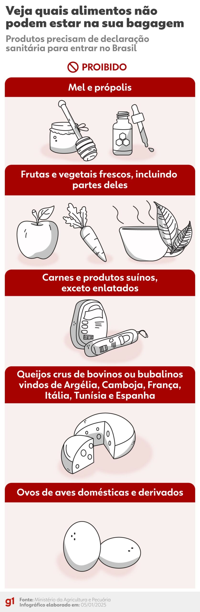 O ovo, por exemplo, não estava na lista de proibições de 2025, mas passa a integrá-la este ano, informou o Ministério da Agricultura ao g1.