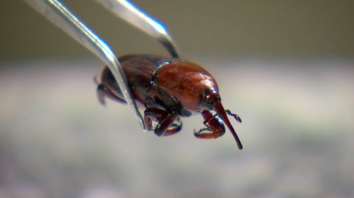 Imagem do besouro bicudo-vermelho que ameaça palmeiras no Brasil.